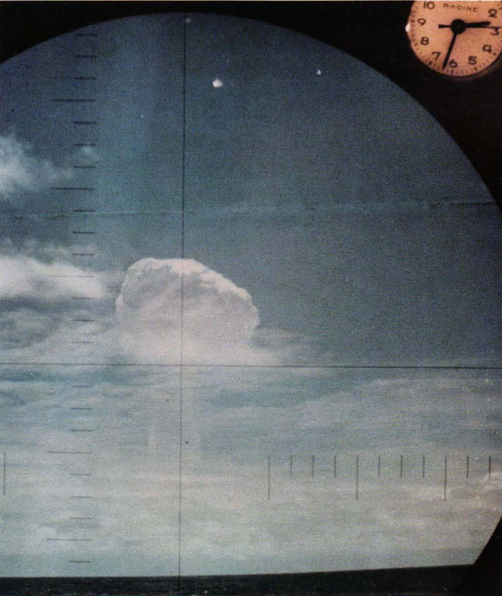 Confirmation of a successful end-to-end flight test of Polaris (Operation Frigate Bird, 6 May 1962). The mushroom cloud from the Polaris warhead detonation is viewed through the periscope of a submarine in the vicinity of the target. This is the only complete test of a U.S. nuclear ballistic missile weapon. Source: Watson, J.M. (1992). Strategic missile submarine force and APL’s role in its development. Johns Hopkins APL Technical Digest, 13(1), 125-137.